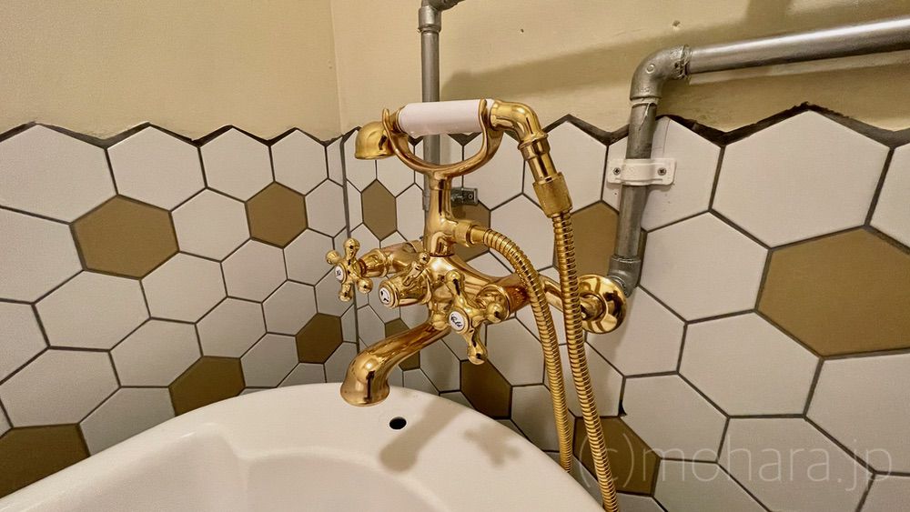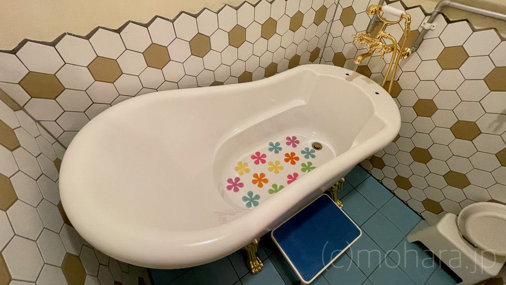 いつもだと、温泉宿では無い場合は夕食前にどこかで温泉に入るのが我が家の定番だったりするのですが、朝も温泉に入ってきたこともあり、今日はこちらの可愛らしいバスタブで入浴します。