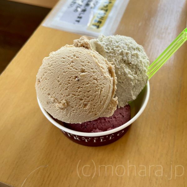 ジェラテリア ミルティーロ 〜ジェラート〜 2022 10/01 2022北海道 スウィーツ 北海道 2022-10-012026-01-15 「北海道旅行記2022」ページはこちら ジェラート屋さんに寄っていきます。植苗の湧水からは30分ほど。 16種類のジェラートから選びます。私がラージ(4種盛り)、クッキーママがレギュラー(3種盛り)です。 ラージ(3種) ラージ(3種)上の反対側から撮影 レギュラー(3種) 選ぶのに苦労するくらい種類が豊富でした。美味しかったです😊 ランチは、テイクアウトガレットです。 Next >> カフェ コフェル 〜カフェ&昼食テイクアウト〜 2022北海道 スウィーツ 北海道 スウィーツ 北海道 旅 植苗の湧水 カフェ コフェル 〜カフェ&昼食テイクアウト〜 関連記事 越後川口SA 売店 〜カフェ&軽食〜 2022-10-02 フェリー 〜下船〜 2022-10-02 フェリー 〜朝食〜 2022-10-02 フェリー 〜朝日〜 2022-10-02 16日目のルート 2022-10-02 フェリー 〜お土産〜 2022-10-01 フェリー 〜グリルでディナー〜 2022-10-01 フェリー乗船 2022-10-01